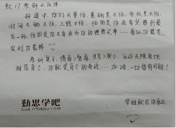 当我以初试,复试成绩均第一名被苏大录取的那一刻我的心情除了激动更多的是感激,我想除了自己的坚持和幸运外,更多的应该是感谢在勤思集训营的日子,感谢我的课程老师刘老师和我的辅导老师索老师,还有教研室刘老师,我专业课成绩230分,对我来说已经很高了,因为我是一个在职初中教师,我刚开始决定考研是在7月份左右,买齐了参考书,听有些辅导班的备考讲座和基础班的视频,花了很多钱,报了很多辅导班,然这些对自制力薄弱又工作的我来说并没卵用,我直到11月份中旬的时候我的课本一遍没看,只看了中教史的古代史,这也许就是别人说的刚开始冲劲太猛,后边就蔫了吧,但是我不甘心,自从我有了这个考研的想法后,我就魔咒一般不想让它成为我生命中的未完成事件,于是我就疯狂的去网上找各种其他包过班,然而这个时候还没过一遍课本的我再没有辅导班愿意承诺我,怕考不好影响辅导班的名声,就在我准备听其他辅导班的劝告先计划踏踏实实过一遍课本准备来年再考的时候,我遇到了勤思课程顾问刘老师,我给她说了我的情况,但刘老师劝我一定要今年考,考研是个持久战,各种折磨,我一想刘老师说的对,与其明年考再折磨自己一年多,还不如一咬牙折磨自己一个多月,但一个多月几乎是不可能了,我反复问刘老师我能不能考上,刘老师坚定的告诉我只要坚持,坚定,没有不可能,我仿佛看到了希望,刘老师针对我在职又自制力薄弱,又毕业多年,身边没有学习氛围的情况建议我参加11中旬为期14天的集训营,我被刘老师鼓励的信心又满满的,在集训营里遇到了志同道合的小伙伴,有漂亮的老师给我们授课,真是前所未有的脑洞大开,每天早起跑步,上午下午听课,晚上学习,一切都有专门的老师负责,我什么都不用管,我只安心的进行头脑风暴,有很多课,比如教育研究方法,中教史,教心等科目老师讲完我们就能当堂记住,我终于明白所谓的高手都是讲求战略的,没有战略的学习是像小学生一样的学习,最终只能感动自己,别指望会有多大成功,因为现在很多学校出题特别灵活,如果你只会每天5点多起床,熬到十一点死学,结局你会很惨的,就算初试勉强过了,你复试也很难脱颖而出的。