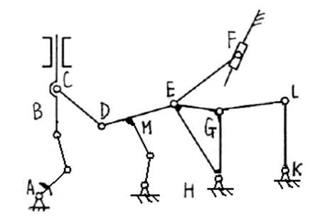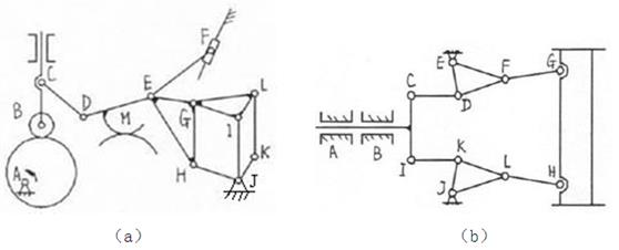 (2)在图(b)中,A、B之一为虚约束;CDEFG、IJKLH之一为虚约束。去除虚约束后,机构简图如图2-5所示。