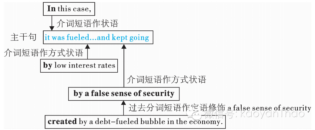 【典型难句】In this case, it was fueled by low interest rates and kept going by a false sense of security created by a debt-fueled bubble in the economy.